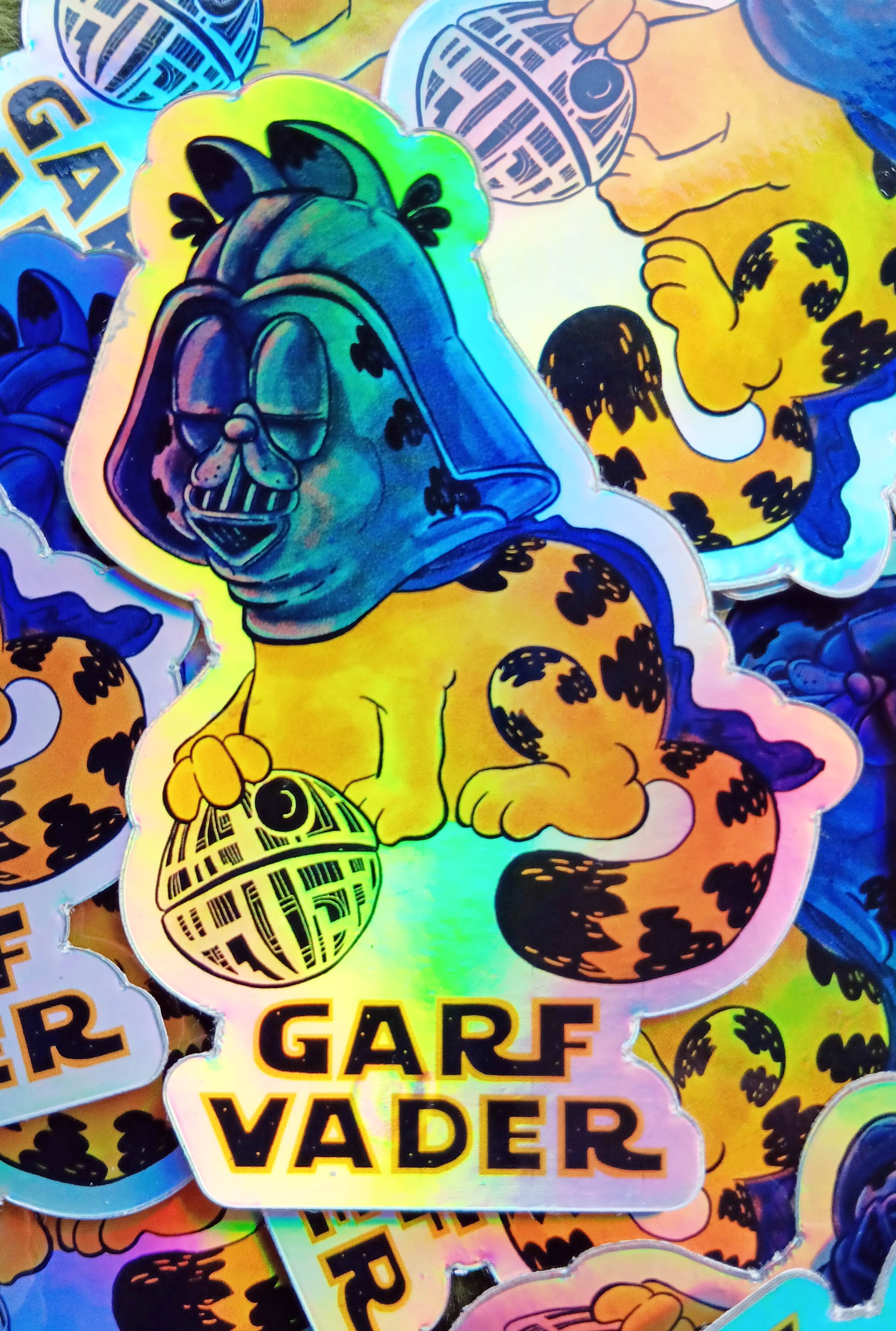 As someone who has never seen Star Wars, I have the utter confidence that this is the right mash-up. Featuring your favourite fat cat and more dad-level puns, enjoy the holographic shine and splendor of Garf Vader!